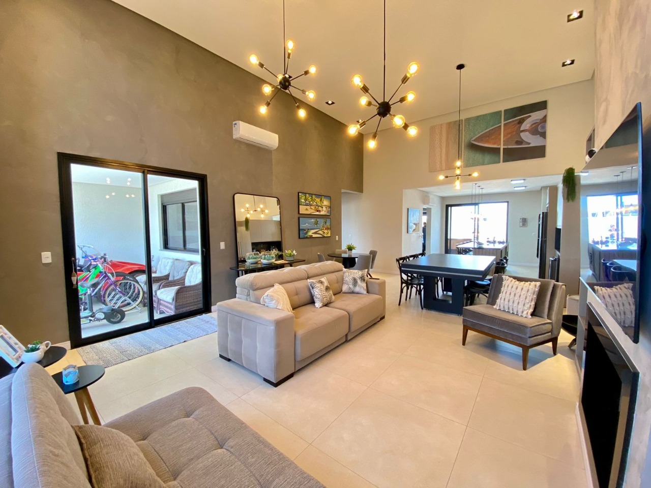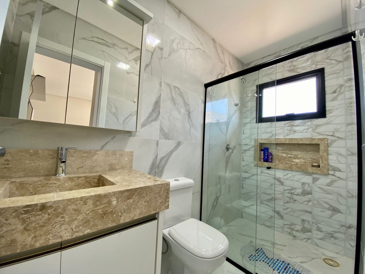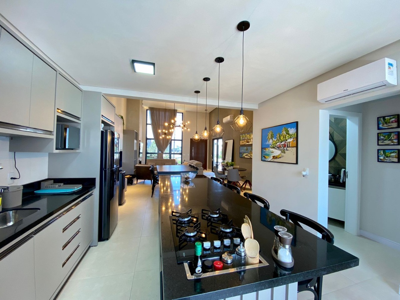 Casa térrea localizada no condomínio Blue, ótima orientação solar, mobiliada e decorada, composta de 3 dormitórios, sendo 3 suítes, amplo living em 3 ambientes com lareira, pé direito alto, dando mais amplitude, lavabo, cozinha com ilha em estilo americana, área de serviço, aos fundos conta com uma maravilhosa área de lazer com deck em madeira tratada, belíssimo paisagismo, ar condicionado em todos os cômodos, moderna e sofisticada fachada, vaga de garagem para 2 carros.
