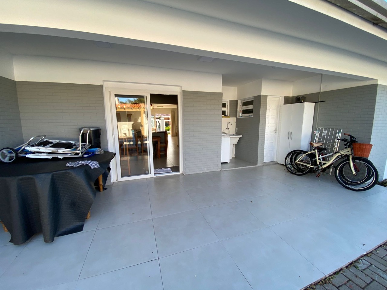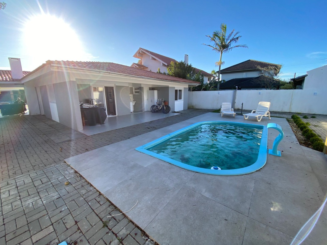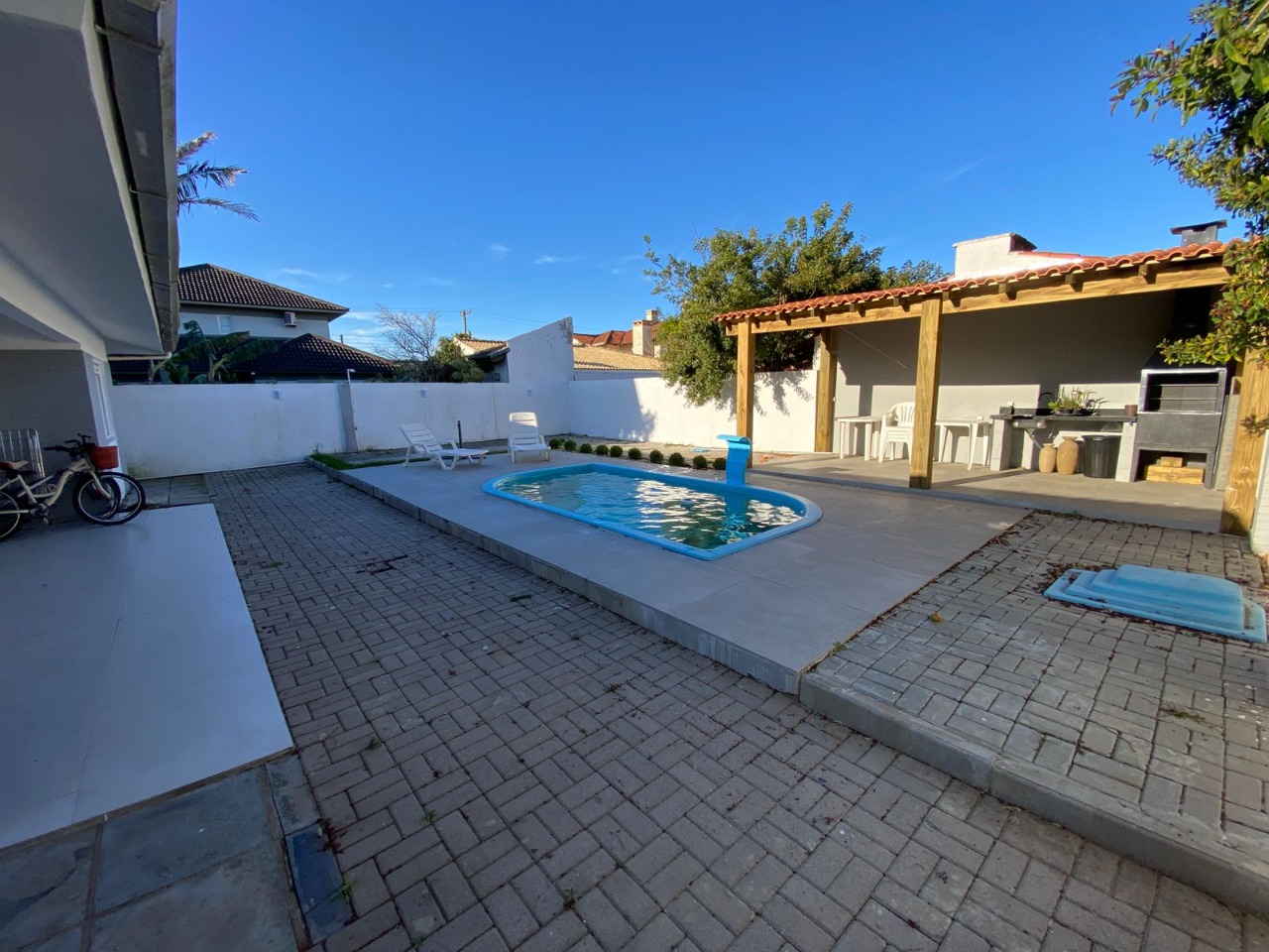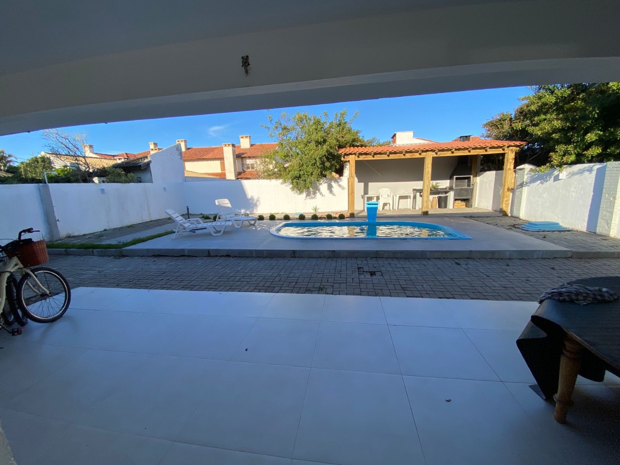 casa próxima ao mar, com uma bela distribuição, bem planejada com ambientes amplos e cômodos, composta por 3 dormitórios sendo 1 suíte, uma bela sala com lareira, sala de jantar, garagem fechada para 1 carro e mais 2 vagas descobertas, cozinha, piscina com cascata, quiosque com churrasqueira, mobiliada e dependência de empregada.