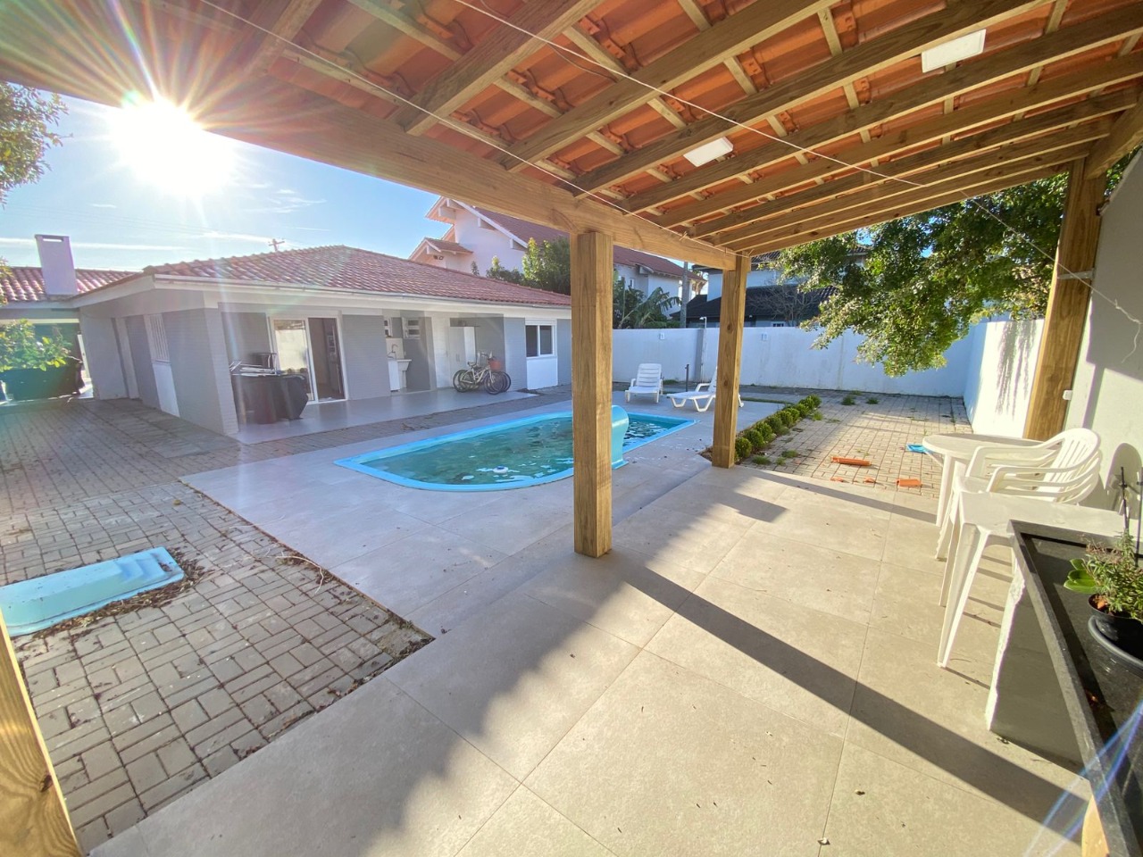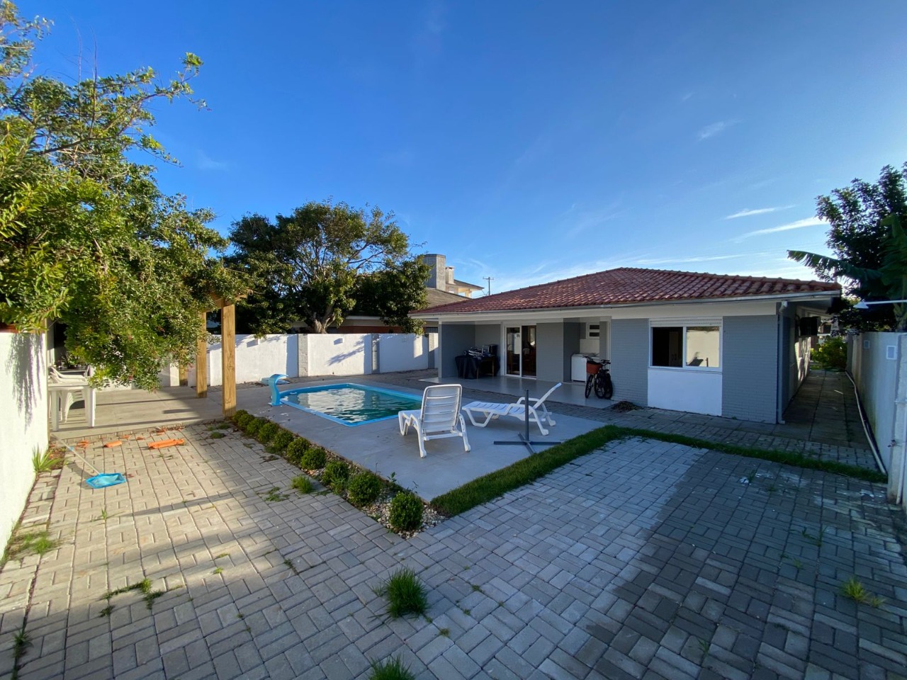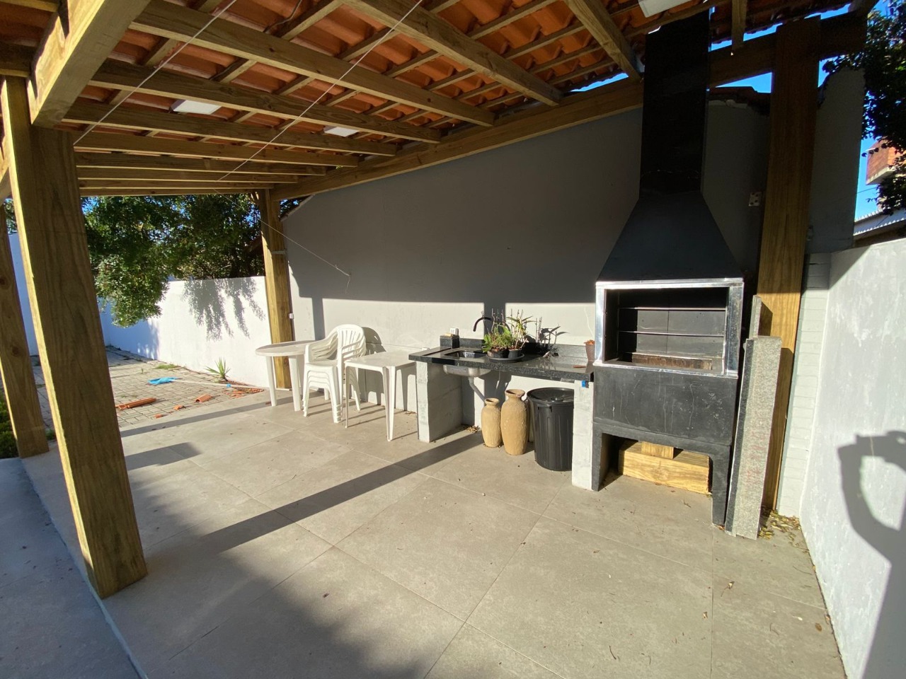 casa próxima ao mar, com uma bela distribuição, bem planejada com ambientes amplos e cômodos, composta por 3 dormitórios sendo 1 suíte, uma bela sala com lareira, sala de jantar, garagem fechada para 1 carro e mais 2 vagas descobertas, cozinha, piscina com cascata, quiosque com churrasqueira, mobiliada e dependência de empregada.
