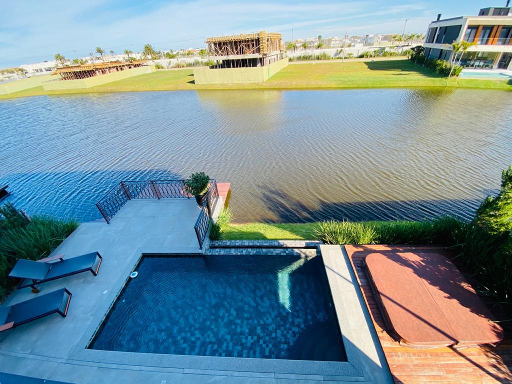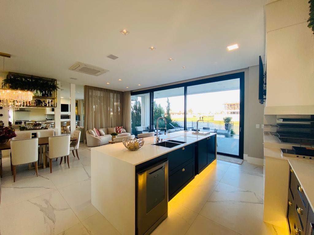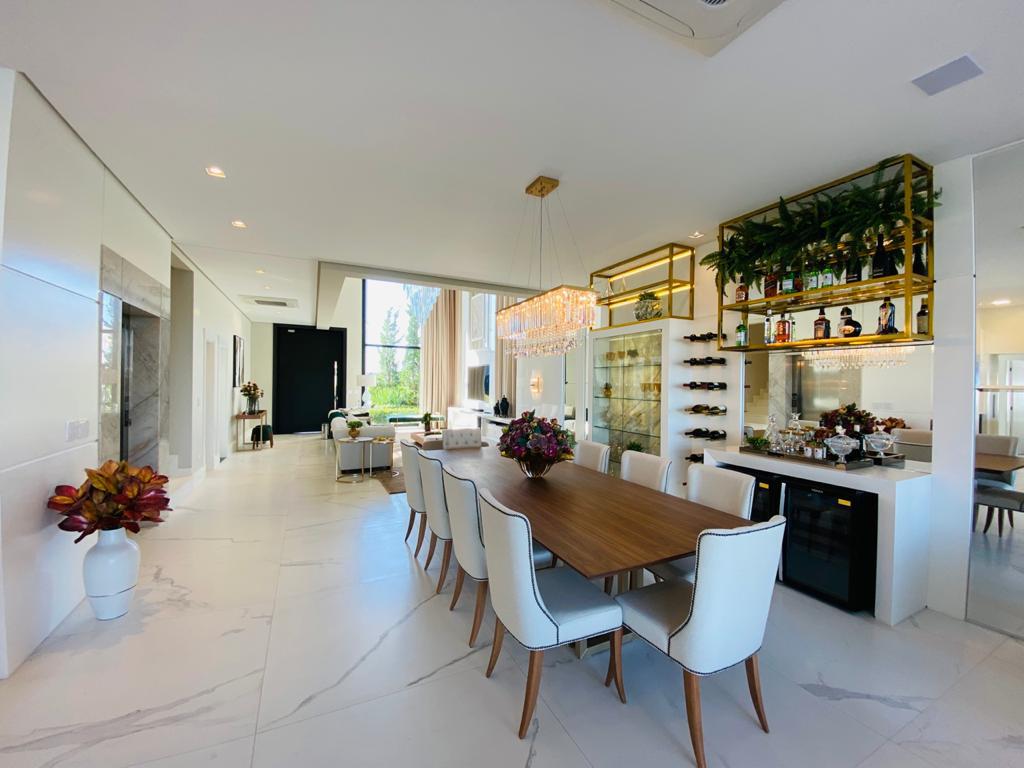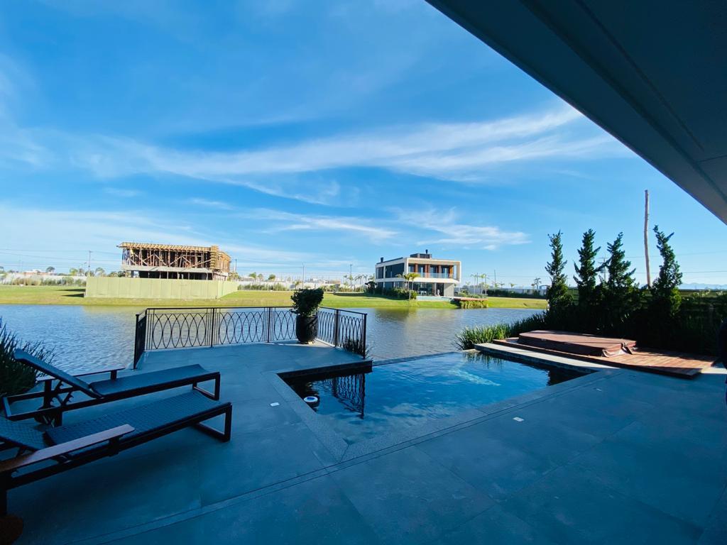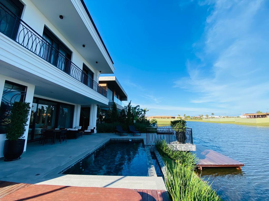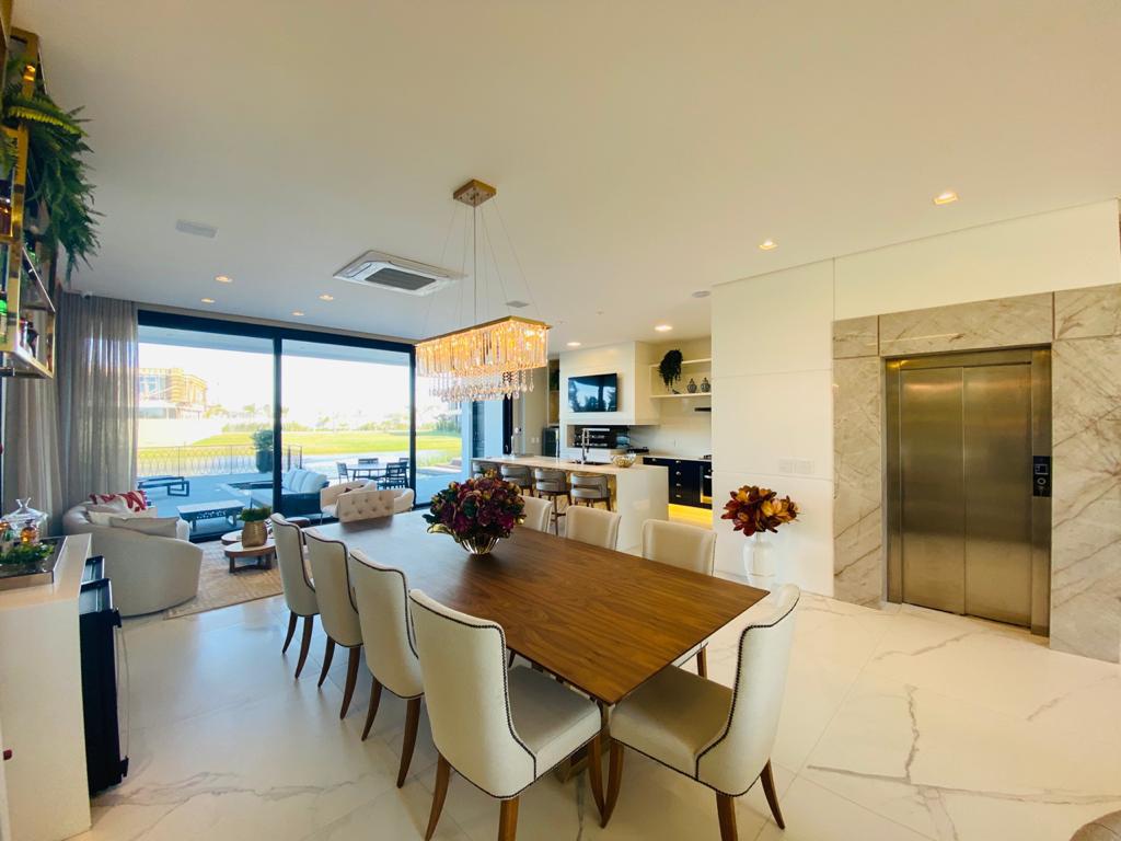 Elegante sobrado estilo neoclássico, finamente mobiliado e decorado, composto por 5 suítes, suite térrea com vista para o lago, amplo living, sala de jantar/estar, dependência de empregada e deposito, escritório, sala de cinema, piso aquecido, elevador, garagem fechada, 100% automatizada, som ambiente e câmera de segurança, piscina com aquecimento solar, borda infinita para o lago com deck suspenso.