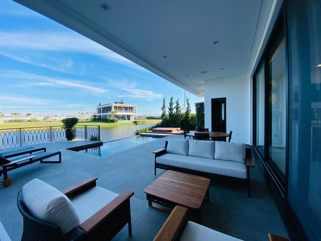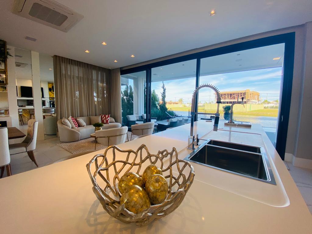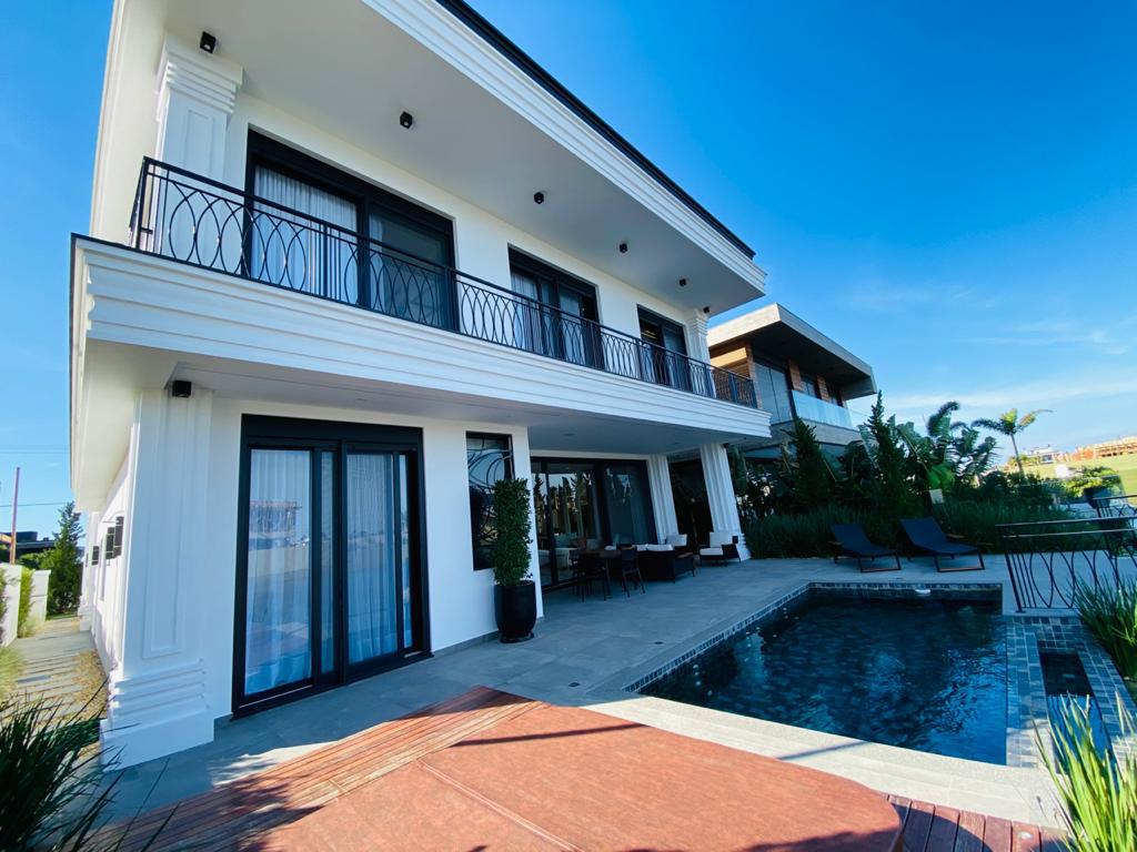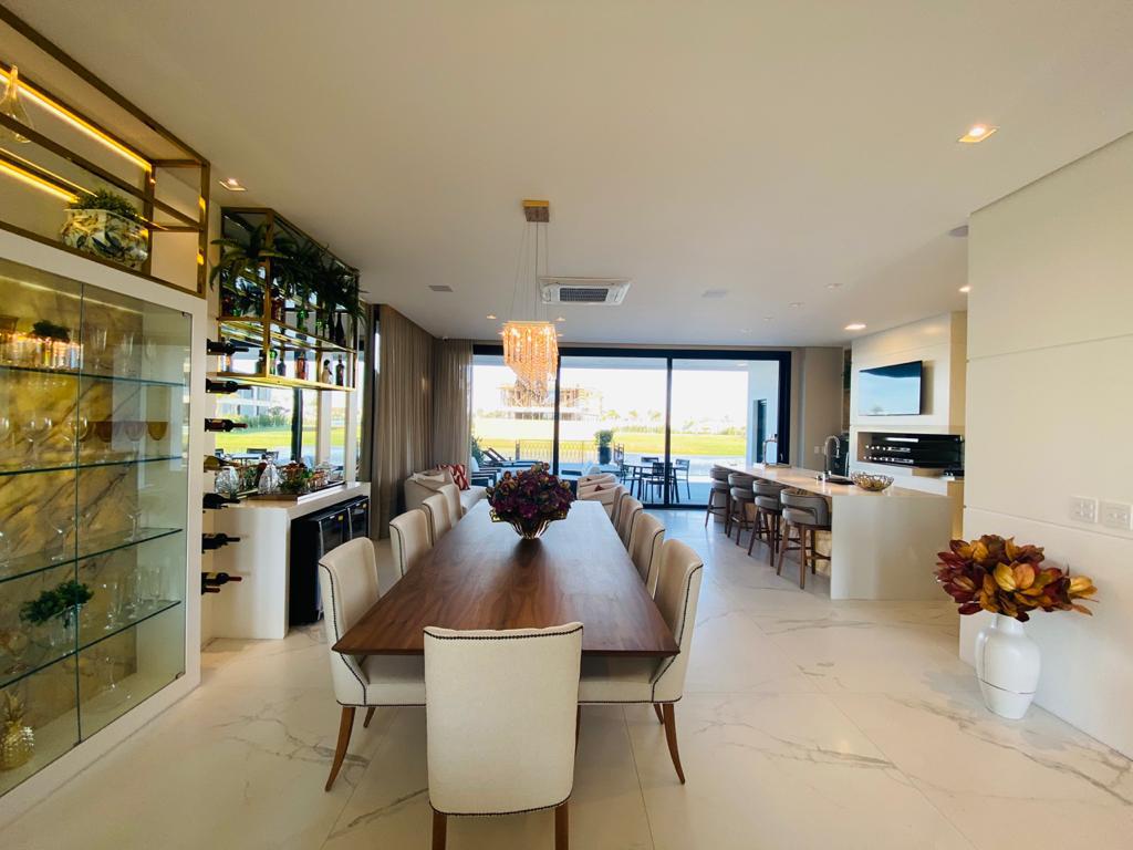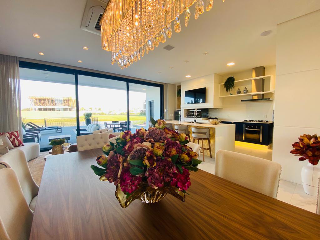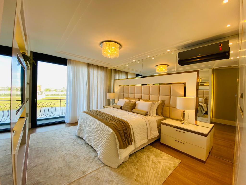 Elegante sobrado estilo neoclássico, finamente mobiliado e decorado, composto por 5 suítes, suite térrea com vista para o lago, amplo living, sala de jantar/estar, dependência de empregada e deposito, escritório, sala de cinema, piso aquecido, elevador, garagem fechada, 100% automatizada, som ambiente e câmera de segurança, piscina com aquecimento solar, borda infinita para o lago com deck suspenso.